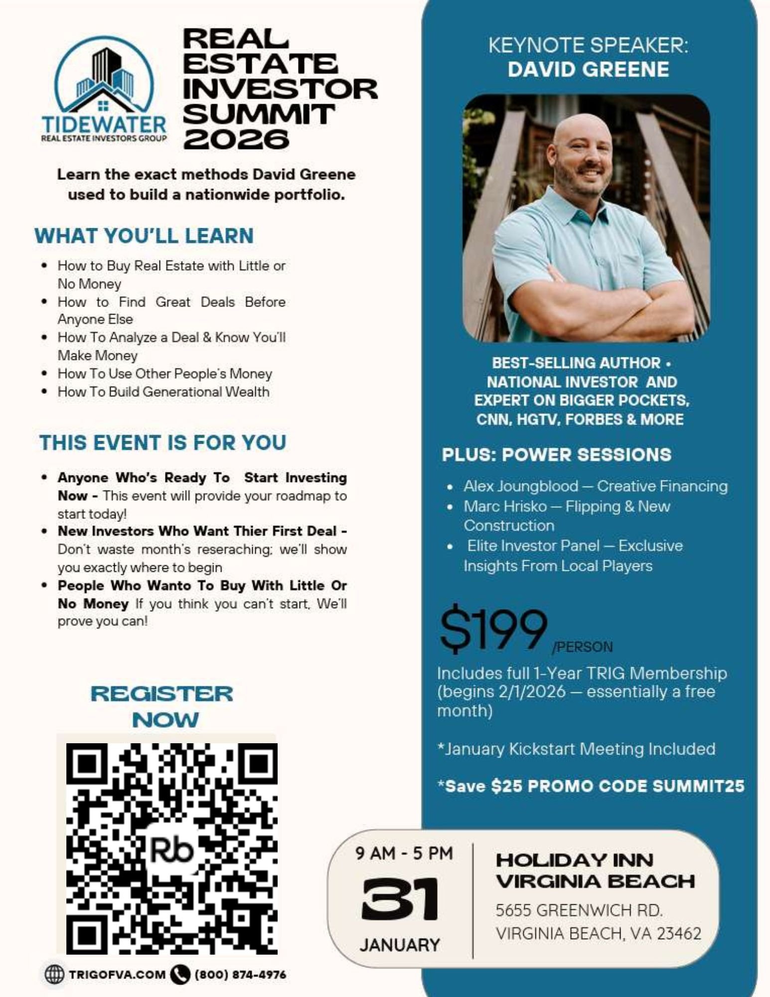 We are reminding you of our sister Investor Group's upcoming TRIG Investor Summit, listed on trigevents.com — a focused educational event for real estate investors looking to sharpen strategy and expand their network. Learn to turn knowledge into closed deals and real wealth. This event is January 31 2026 at the Holiday Inn 5655 Greenwich Rd, Virginia Beach.